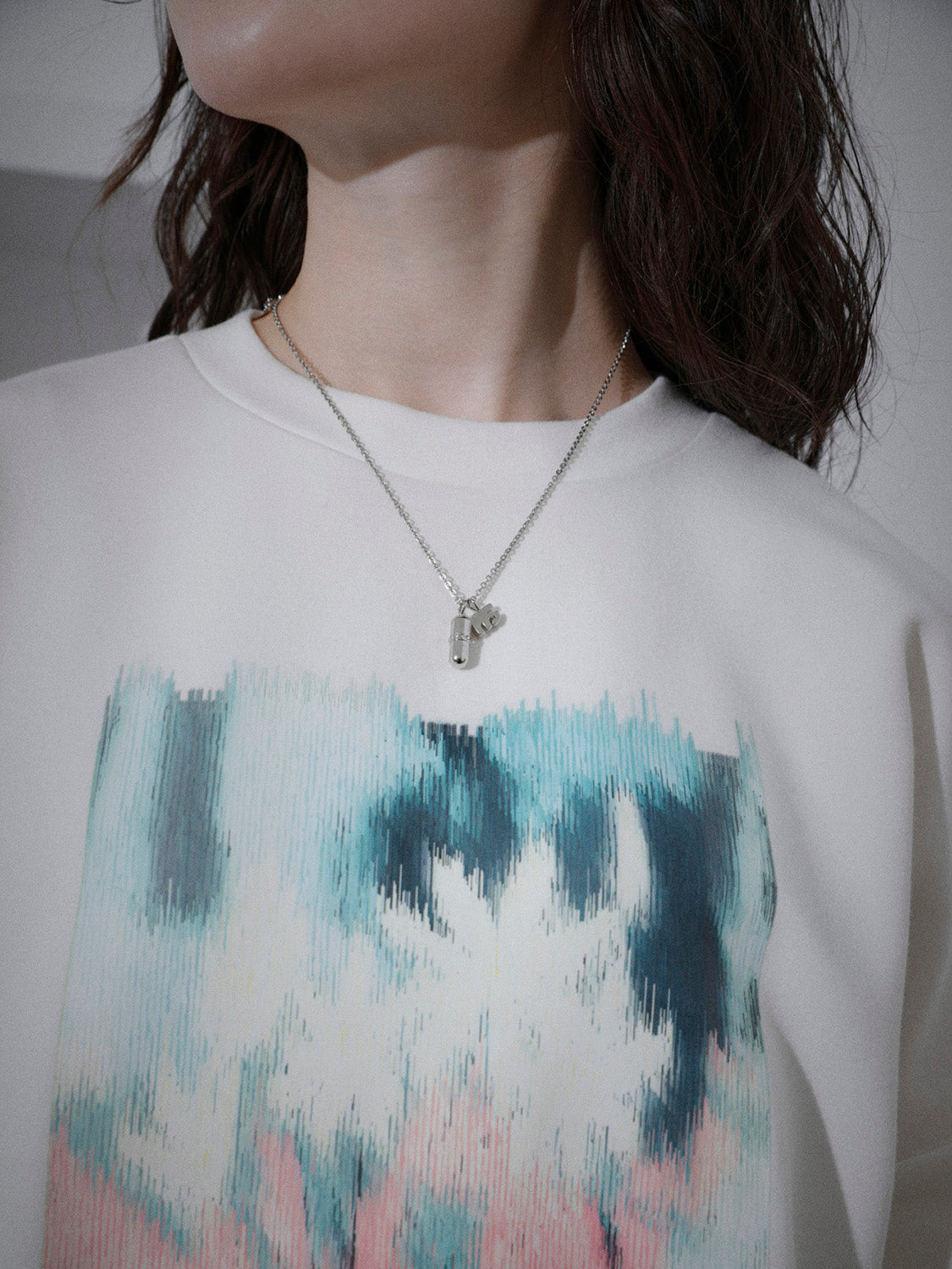 【スタイリング】カジュアルなTシャツスタイルにも、モードなスタイルにも合わせやすいネックレスです。