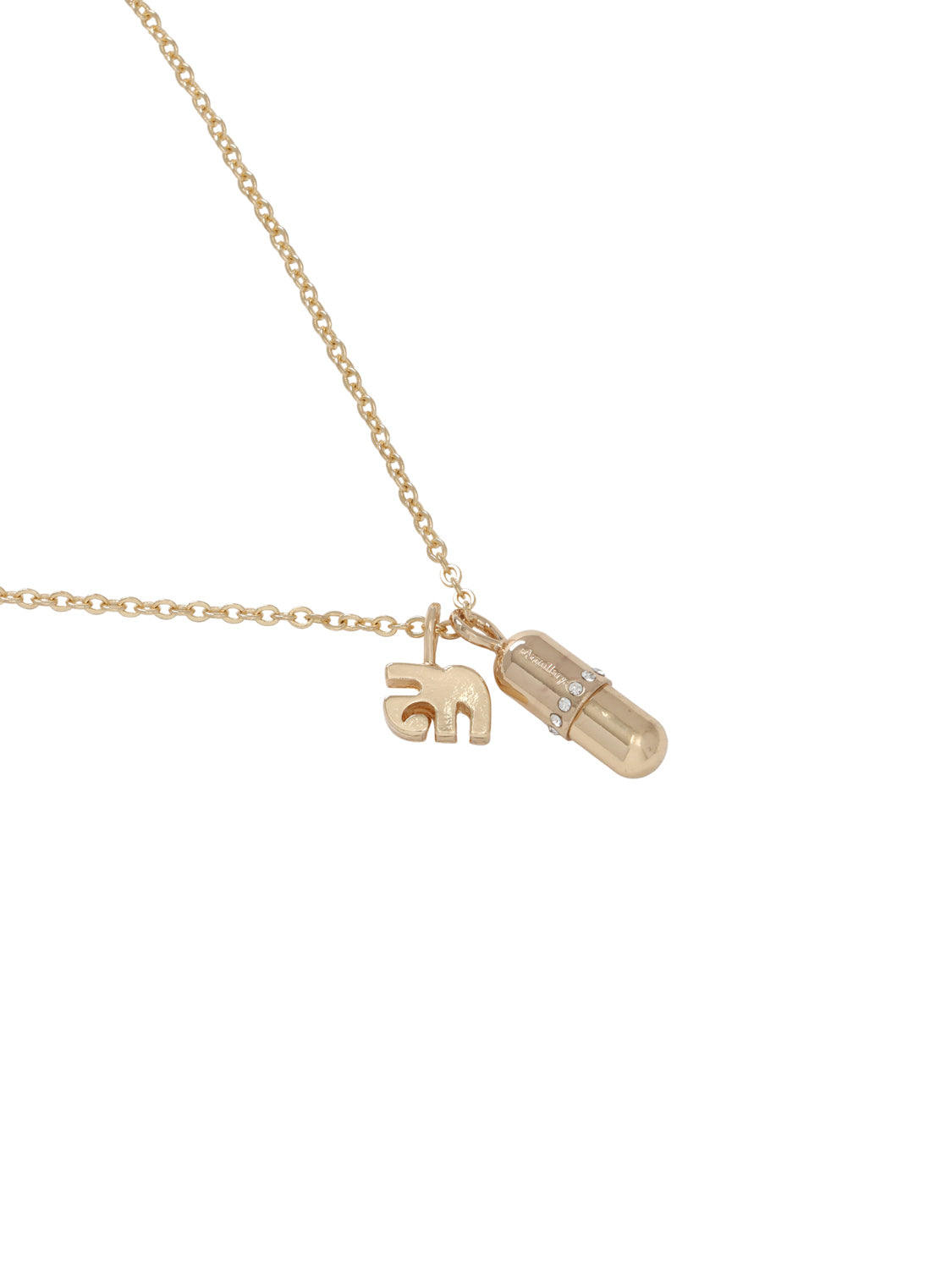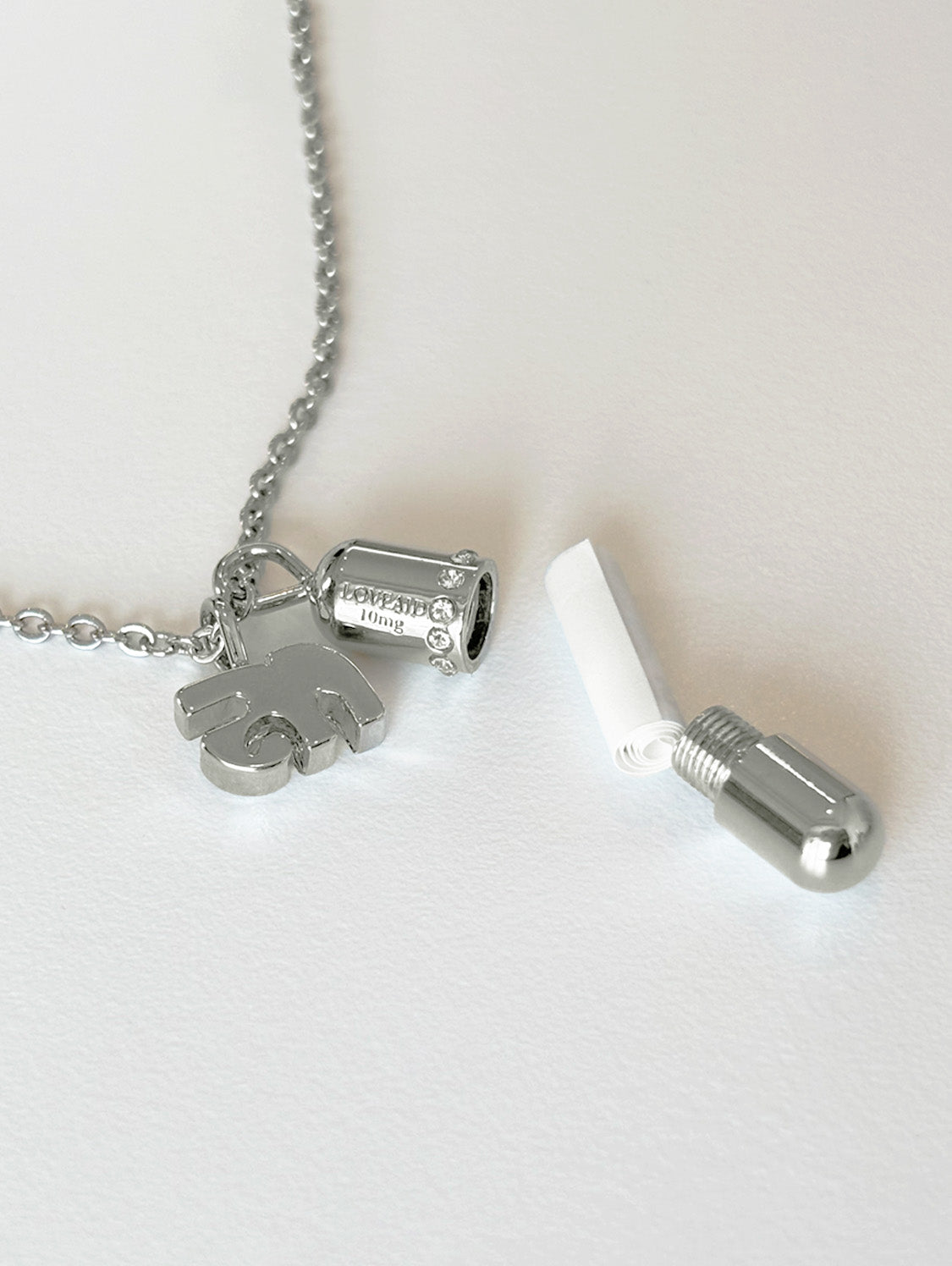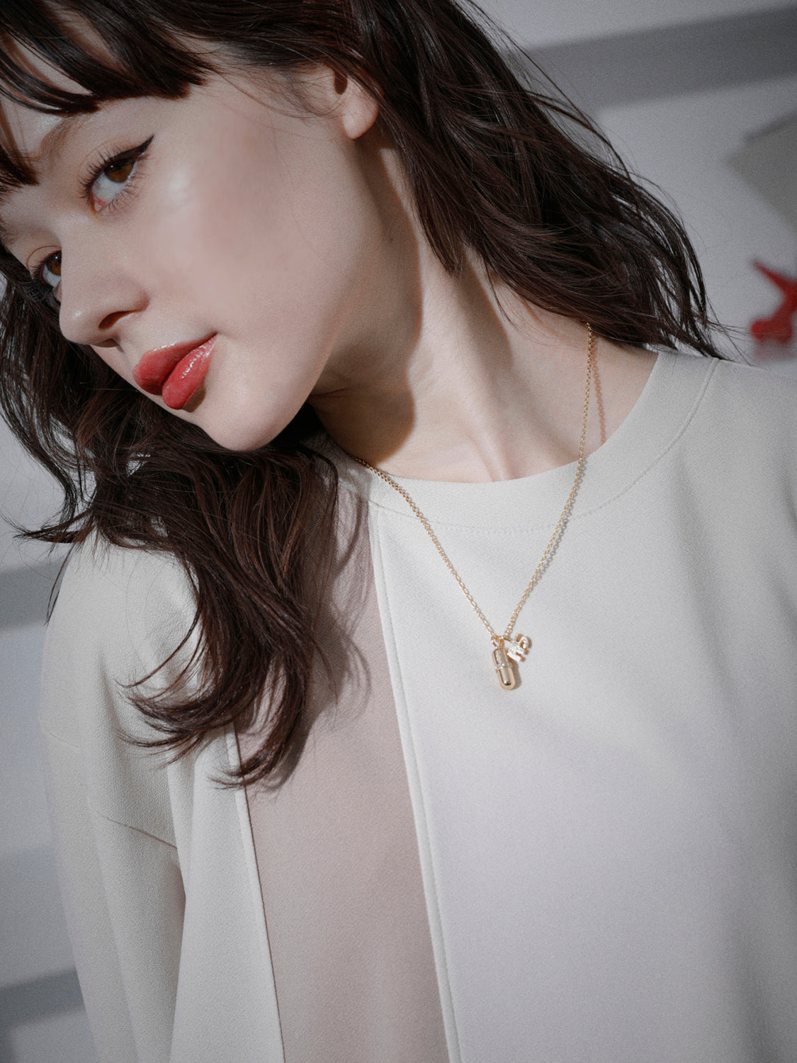 【デザイン】ピル型チャームとamロゴチャームがついた遊び心を込めたネックレス。メインのカプセルチャームには"LOVEAID 10mg”と"Armillary."の刻印があります。カプセルにはクリアストーンをあしらい、上品な輝きをプラス。カプセルチャームは開閉可能で、中には秘密のフレーズを忍ばせた小さな紙が入っています。
