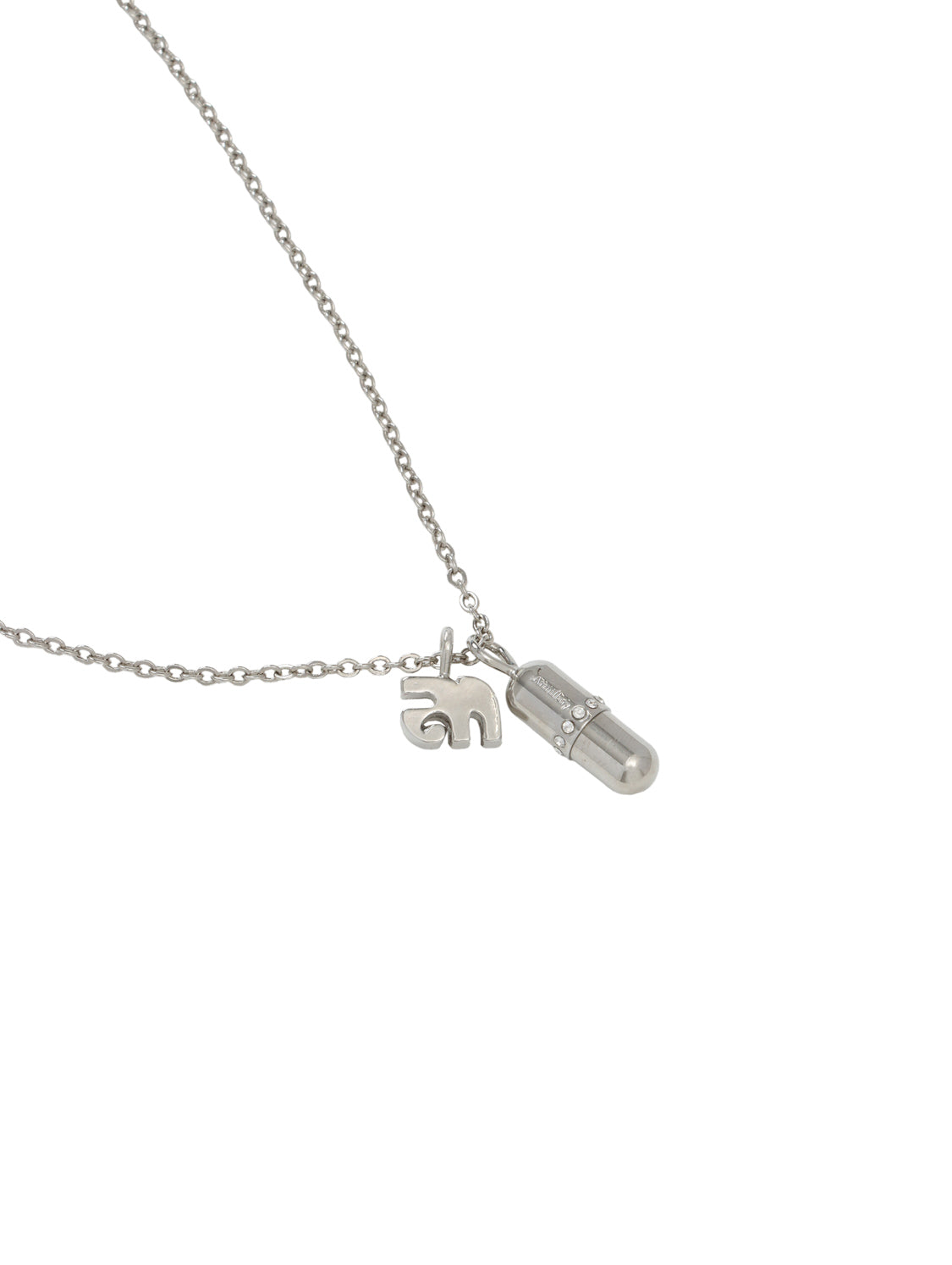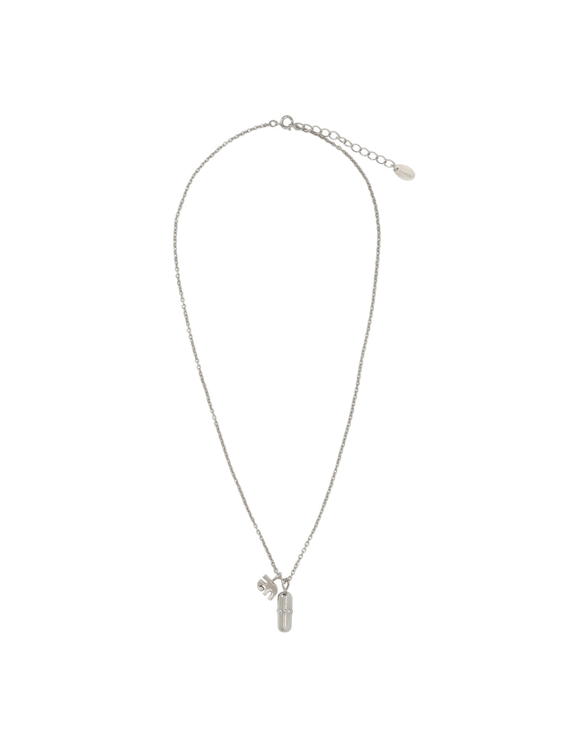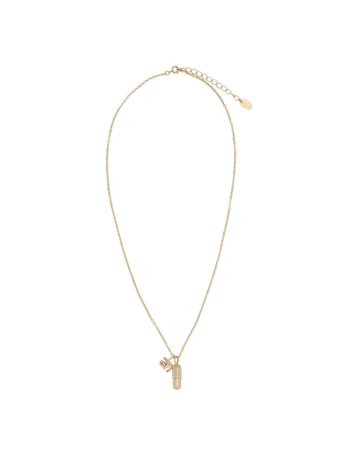 【デザイン】ピル型チャームとamロゴチャームがついた遊び心を込めたネックレス。メインのカプセルチャームには"LOVEAID 10mg”と"Armillary."の刻印があります。カプセルにはクリアストーンをあしらい、上品な輝きをプラス。カプセルチャームは開閉可能で、中には秘密のフレーズを忍ばせた小さな紙が入っています。