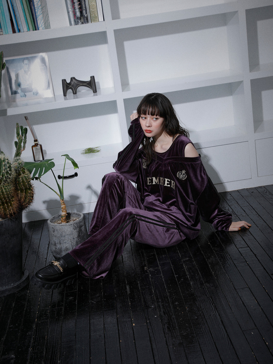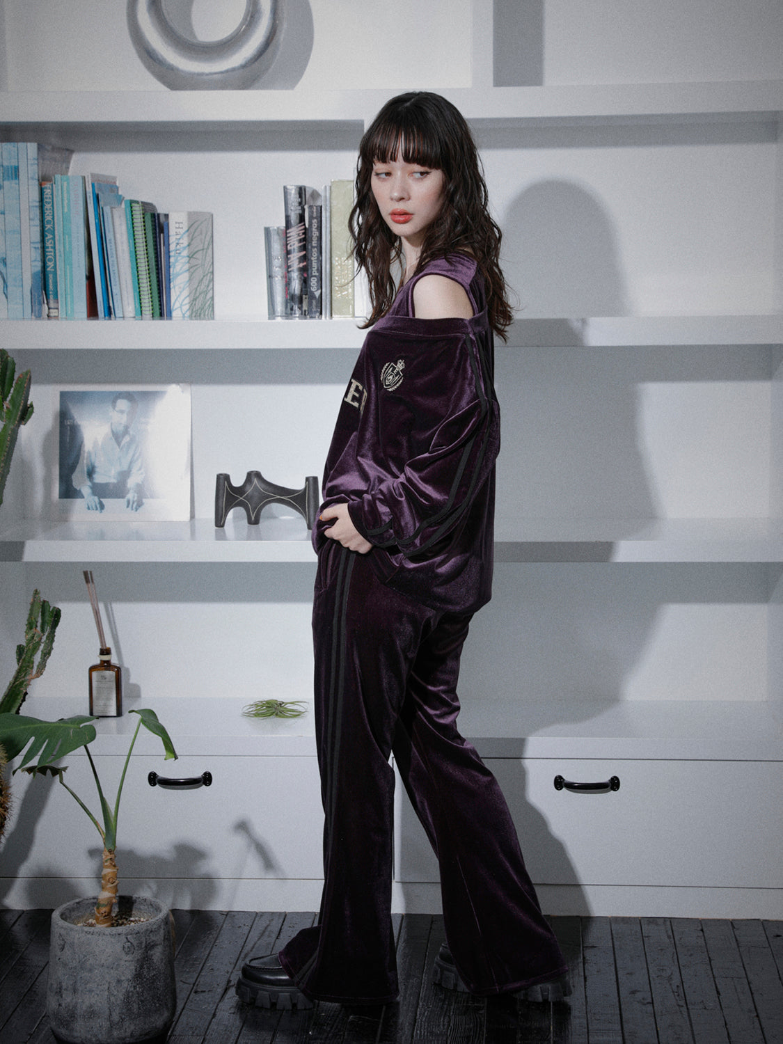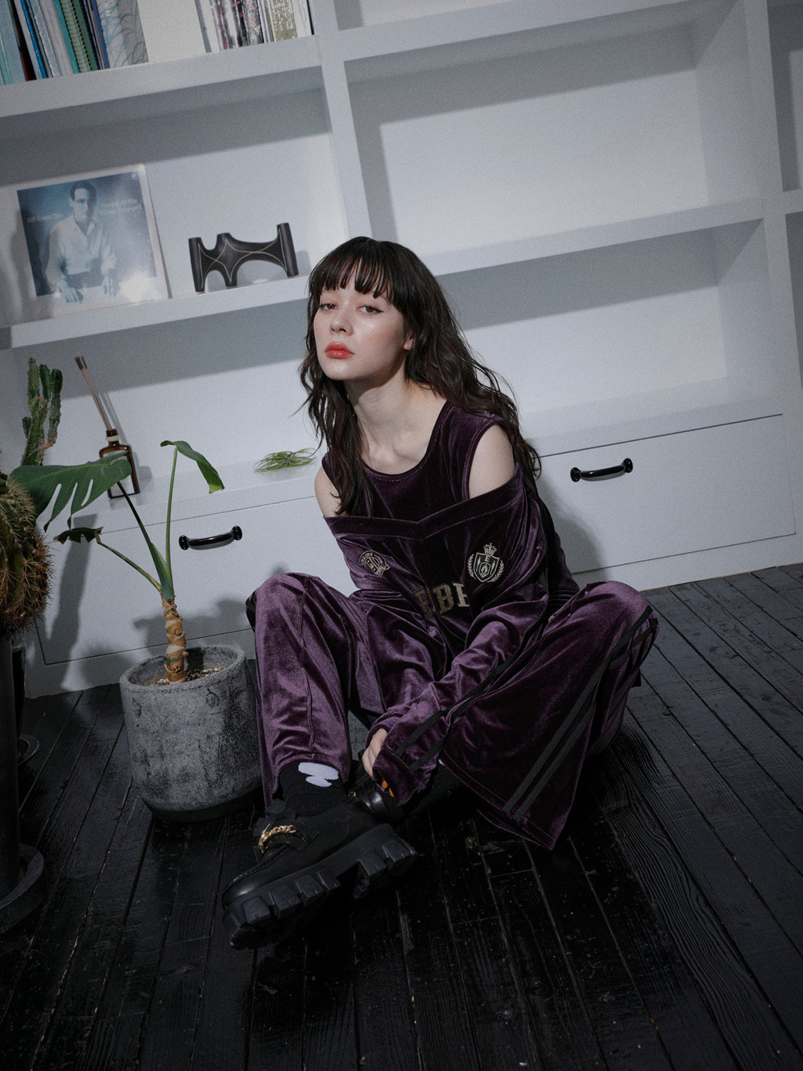 同素材のVELOUR FLARE PANTSとセットアップでの着こなしが一押し。