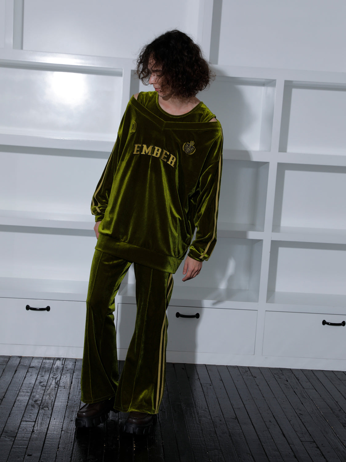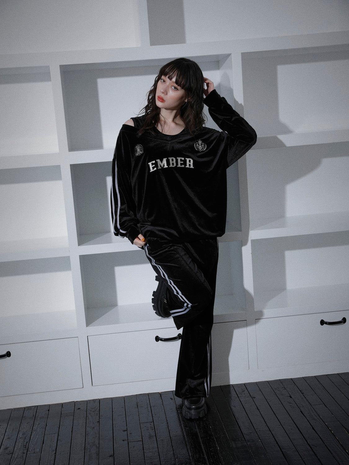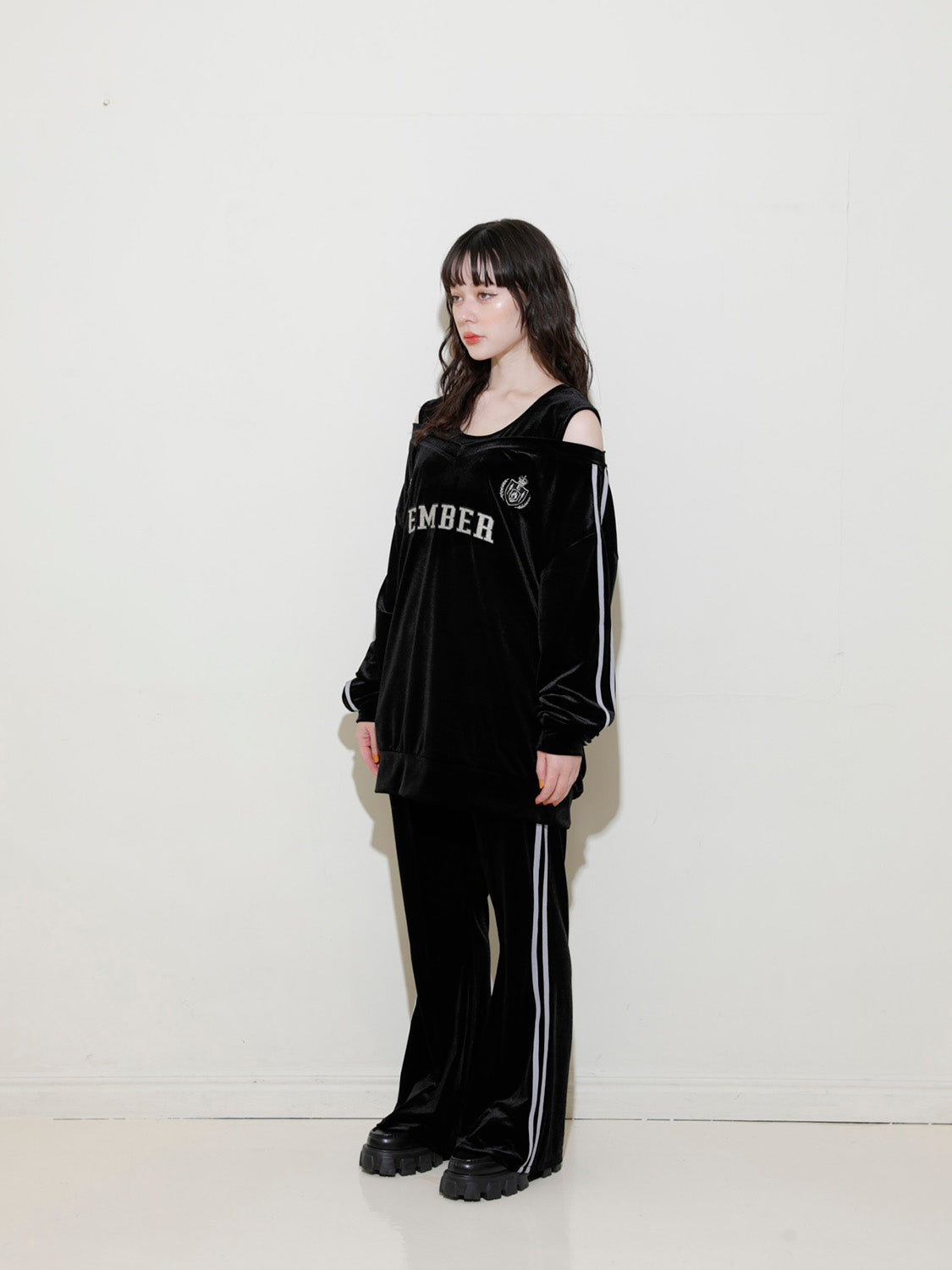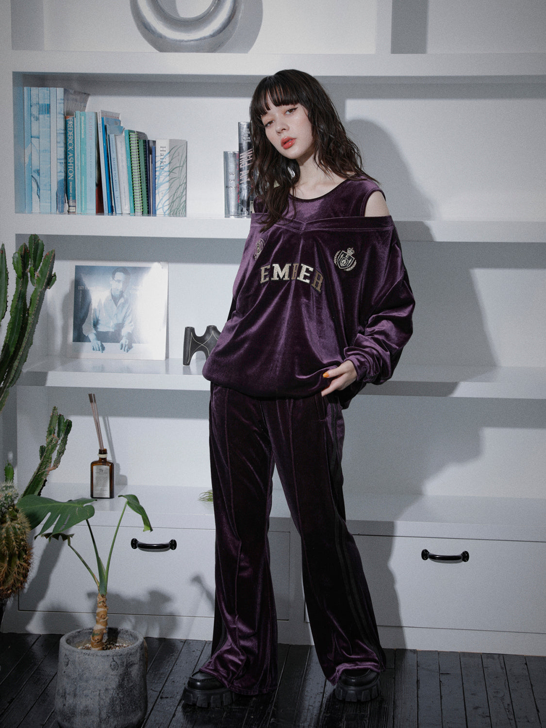 同素材のVELOUR FLARE PANTSとセットアップでの着こなしが一押し。