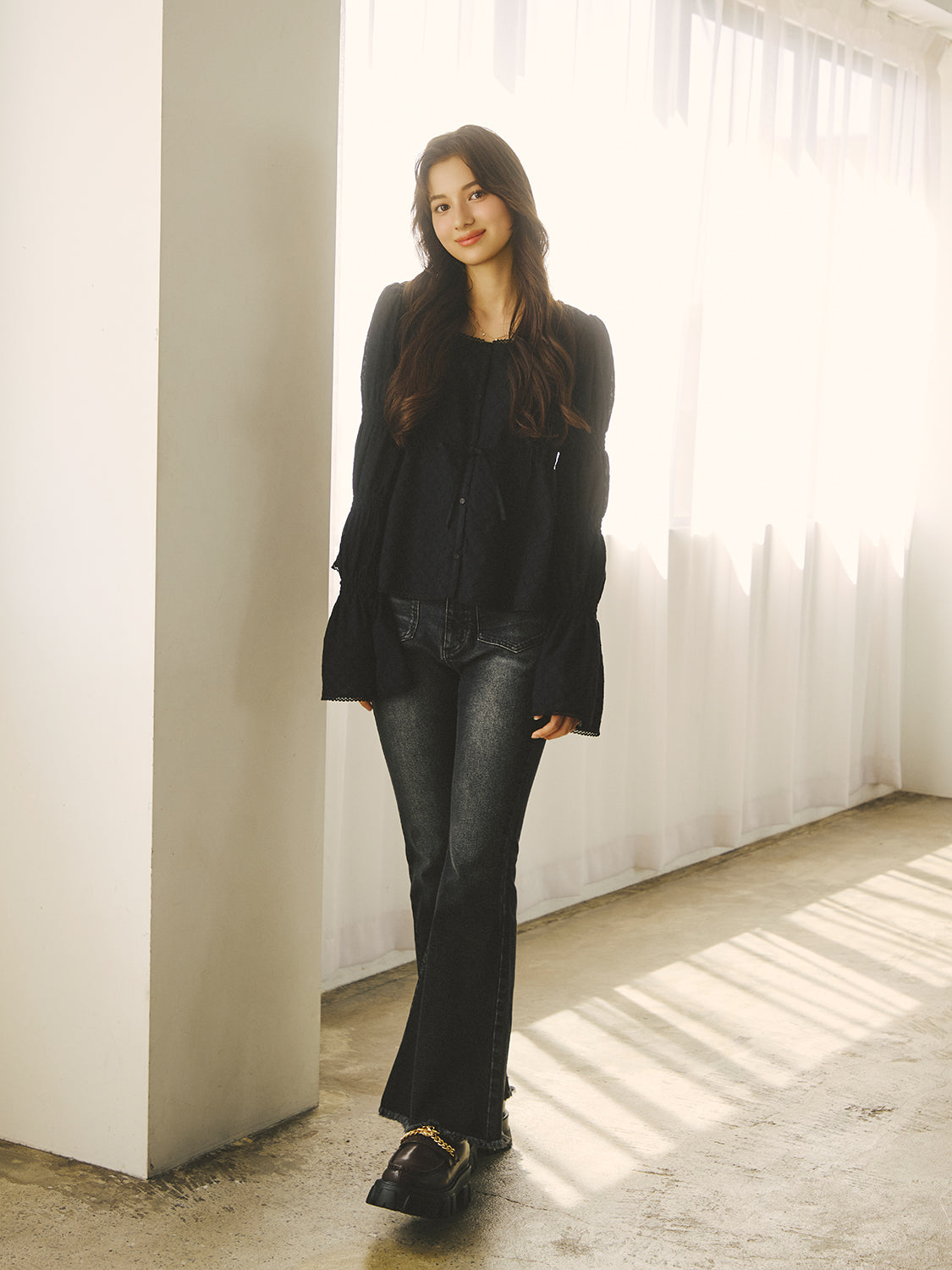 甘めのブラウスやフェミニンなトップスとの相性も◎