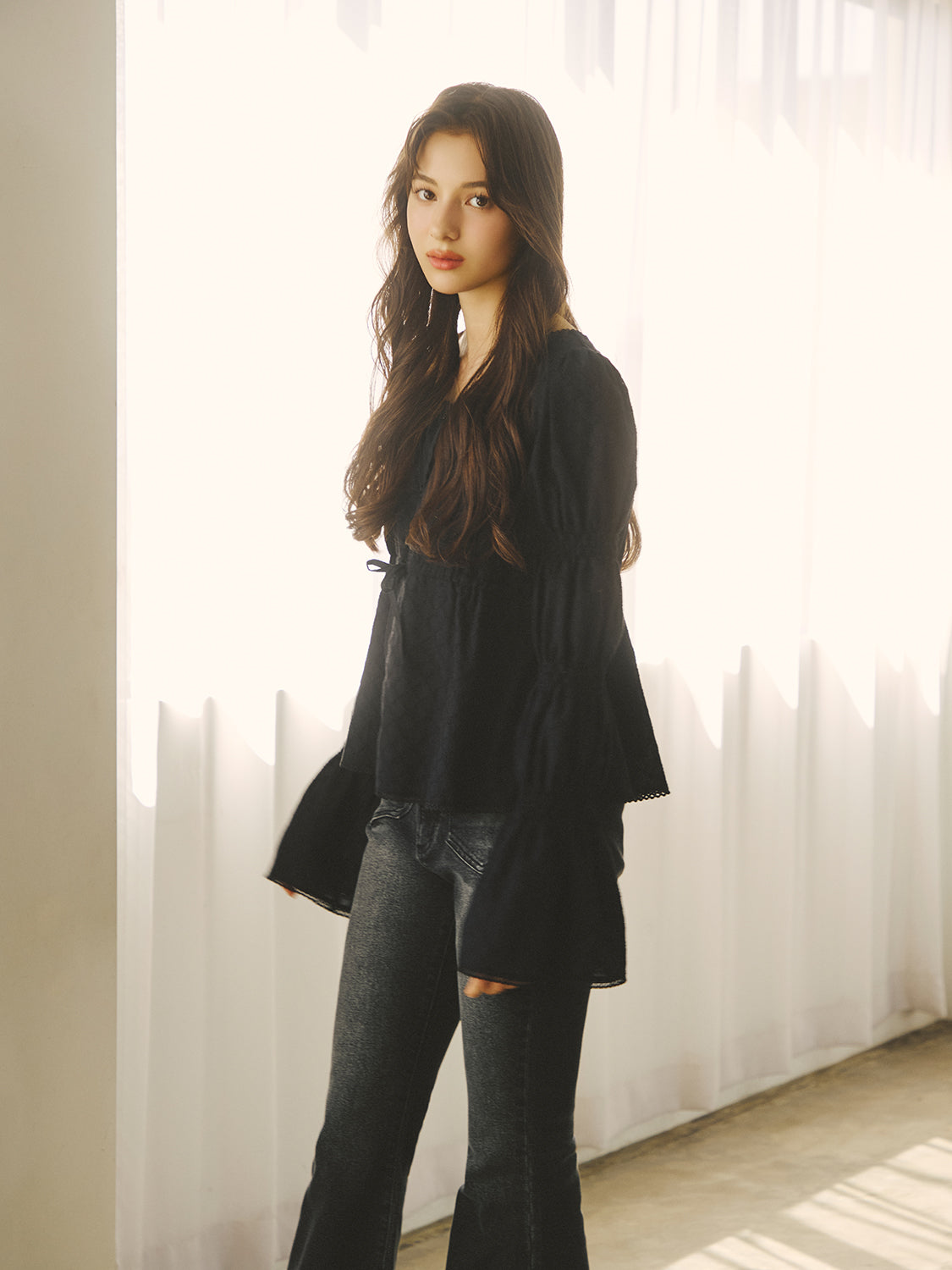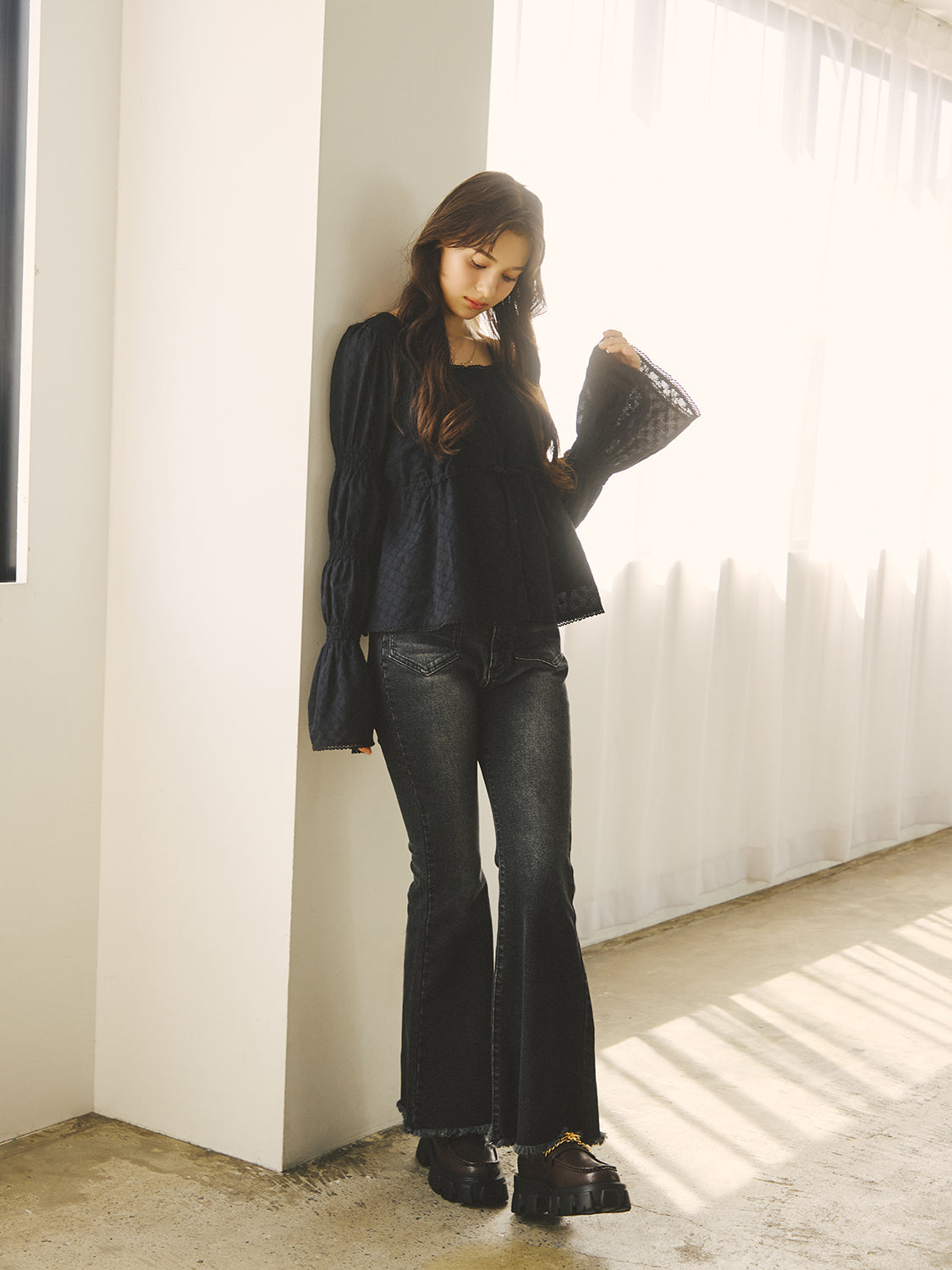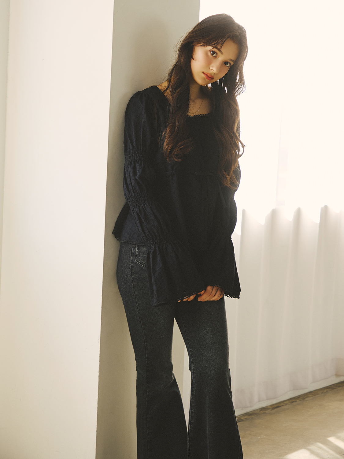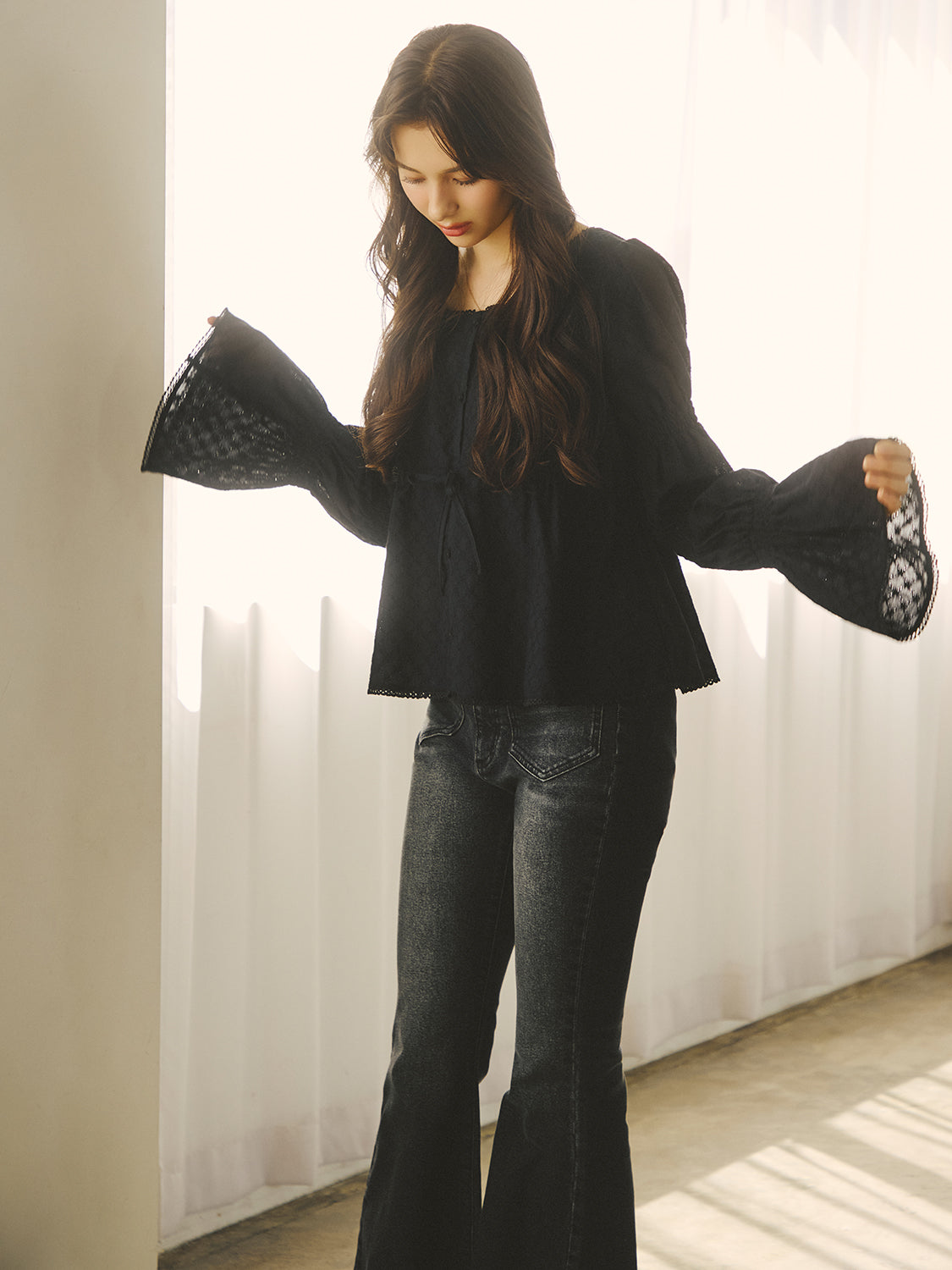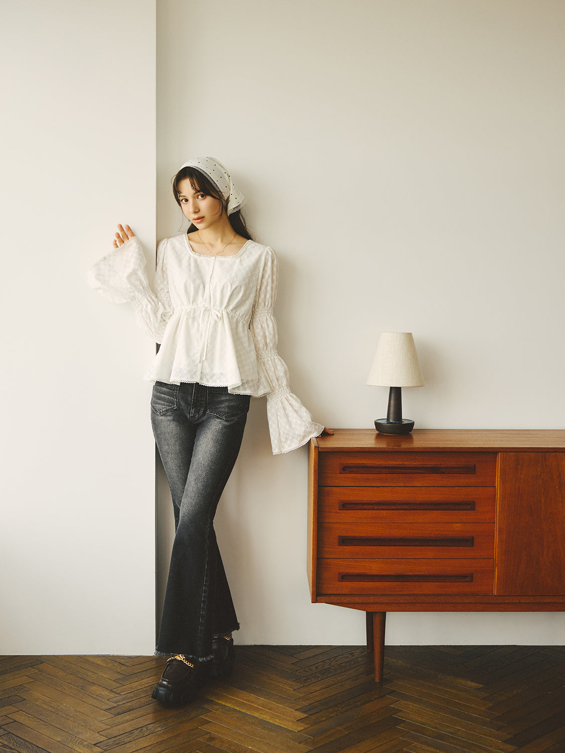 裾・袖口・首周りにはレースをあしらい、ディテールに柔らかなフェミニンさを添えました。