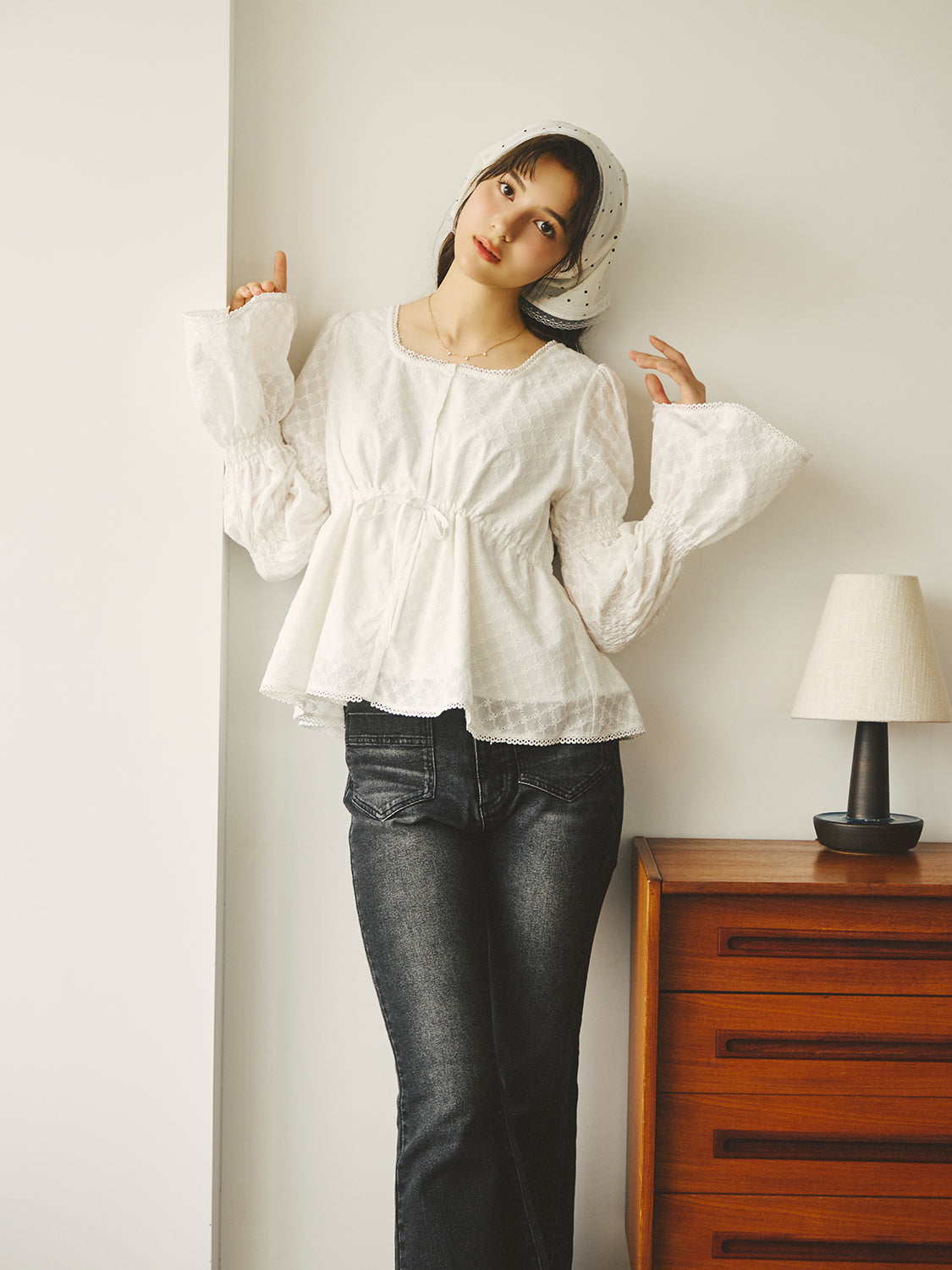 アイレット刺繍のコットン生地をふんだんに使った、軽やかなブラウス。