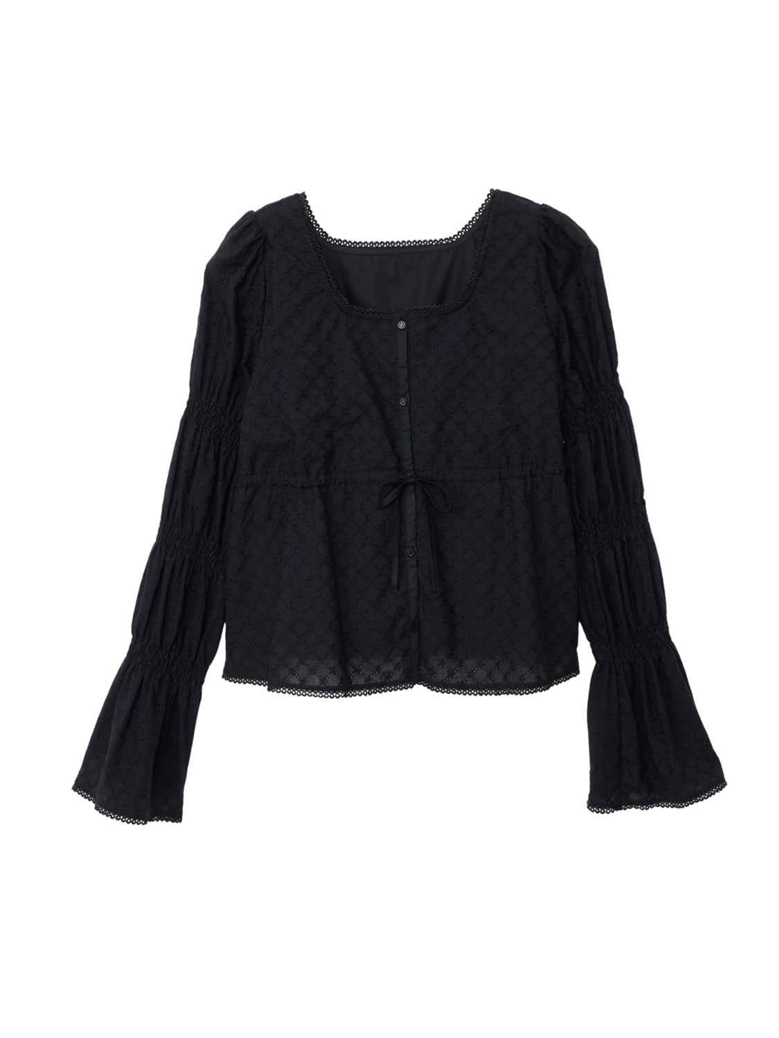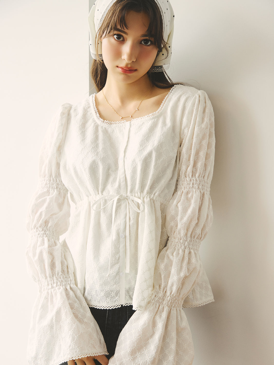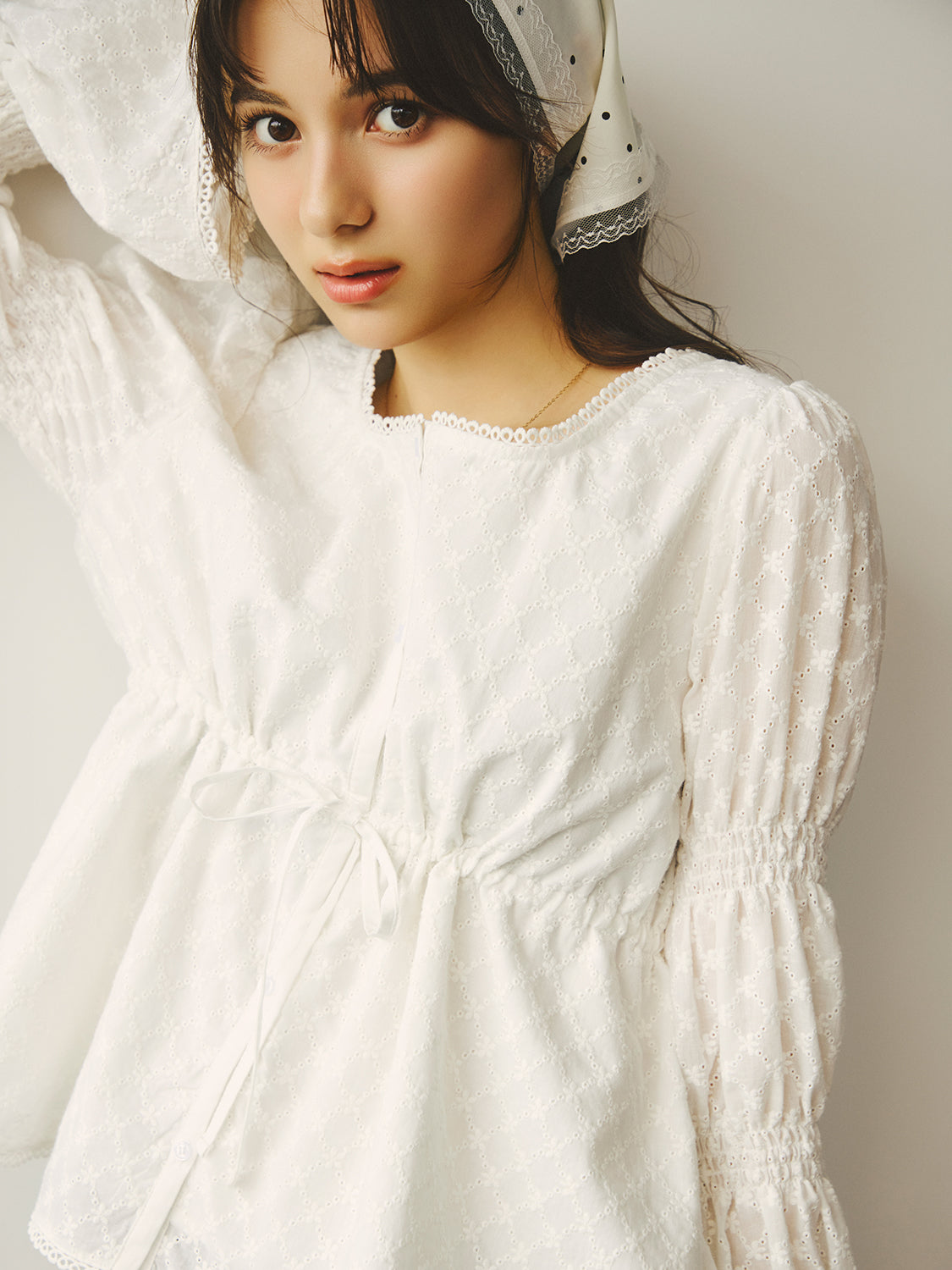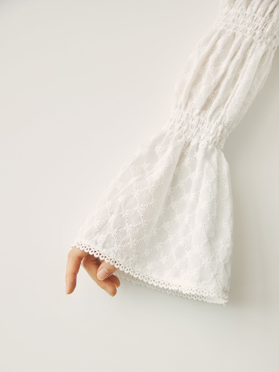 アイレット刺繍が施されたコットン100%のブラウス生地を使用。