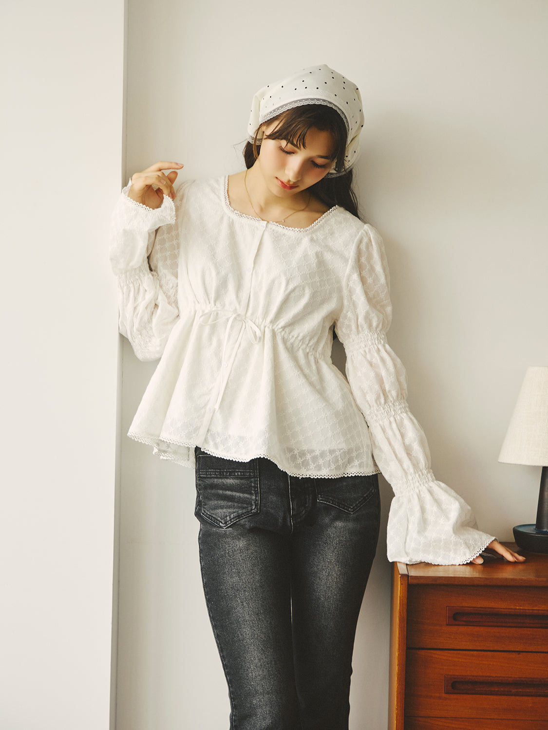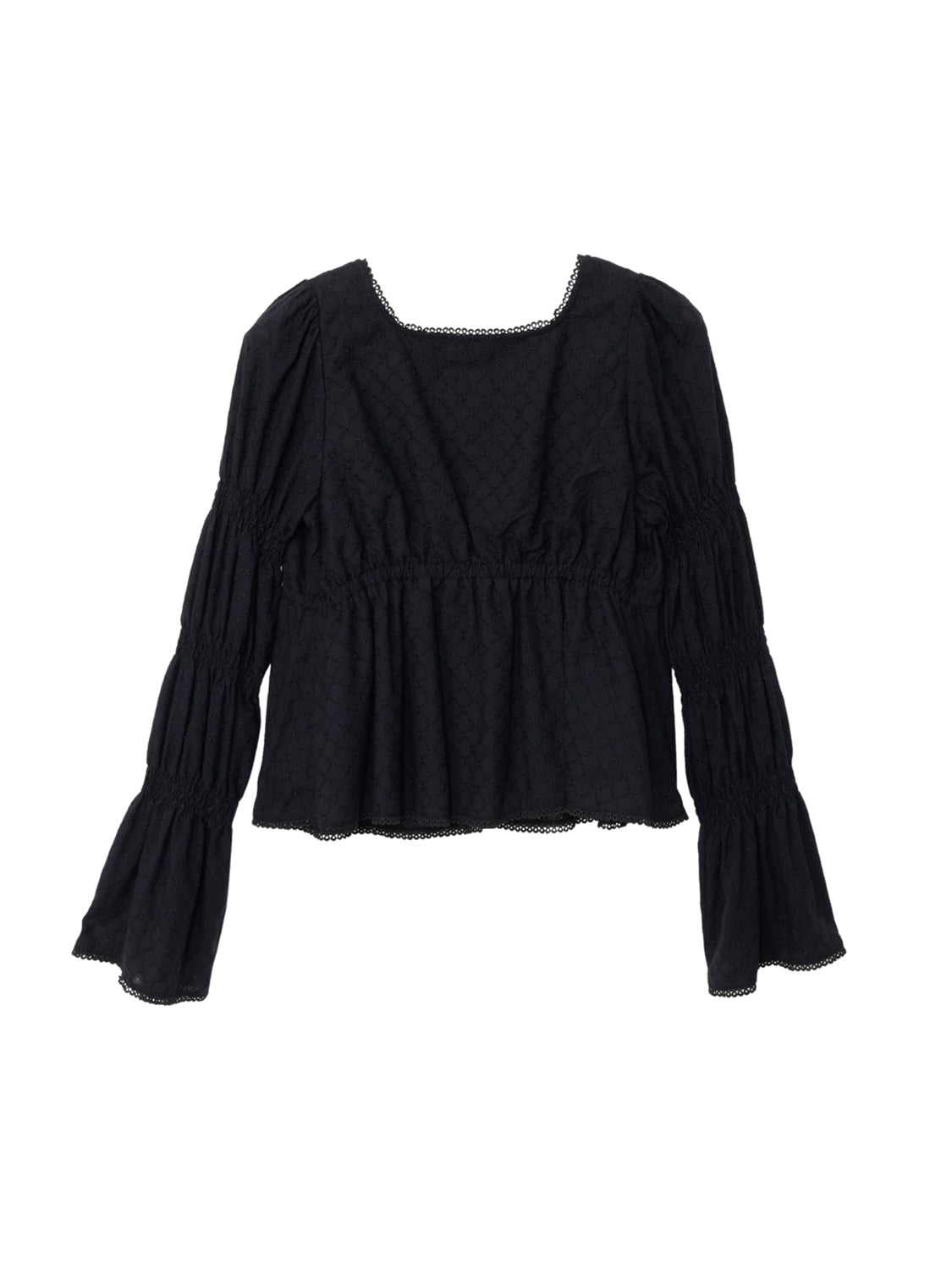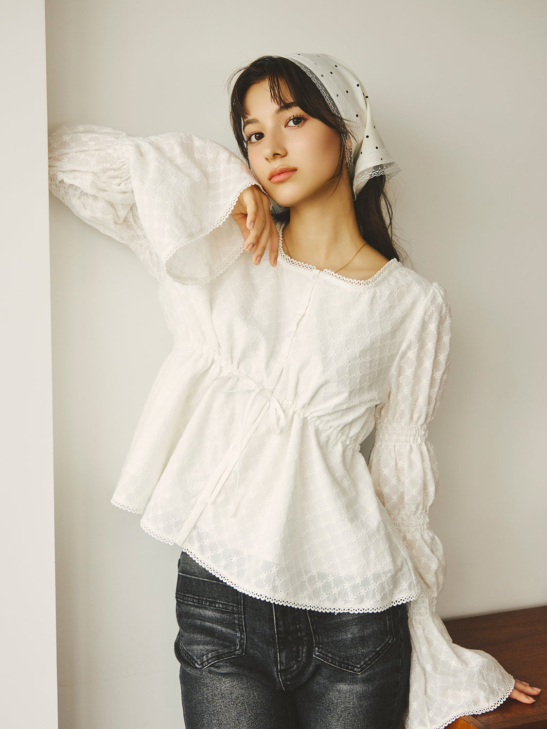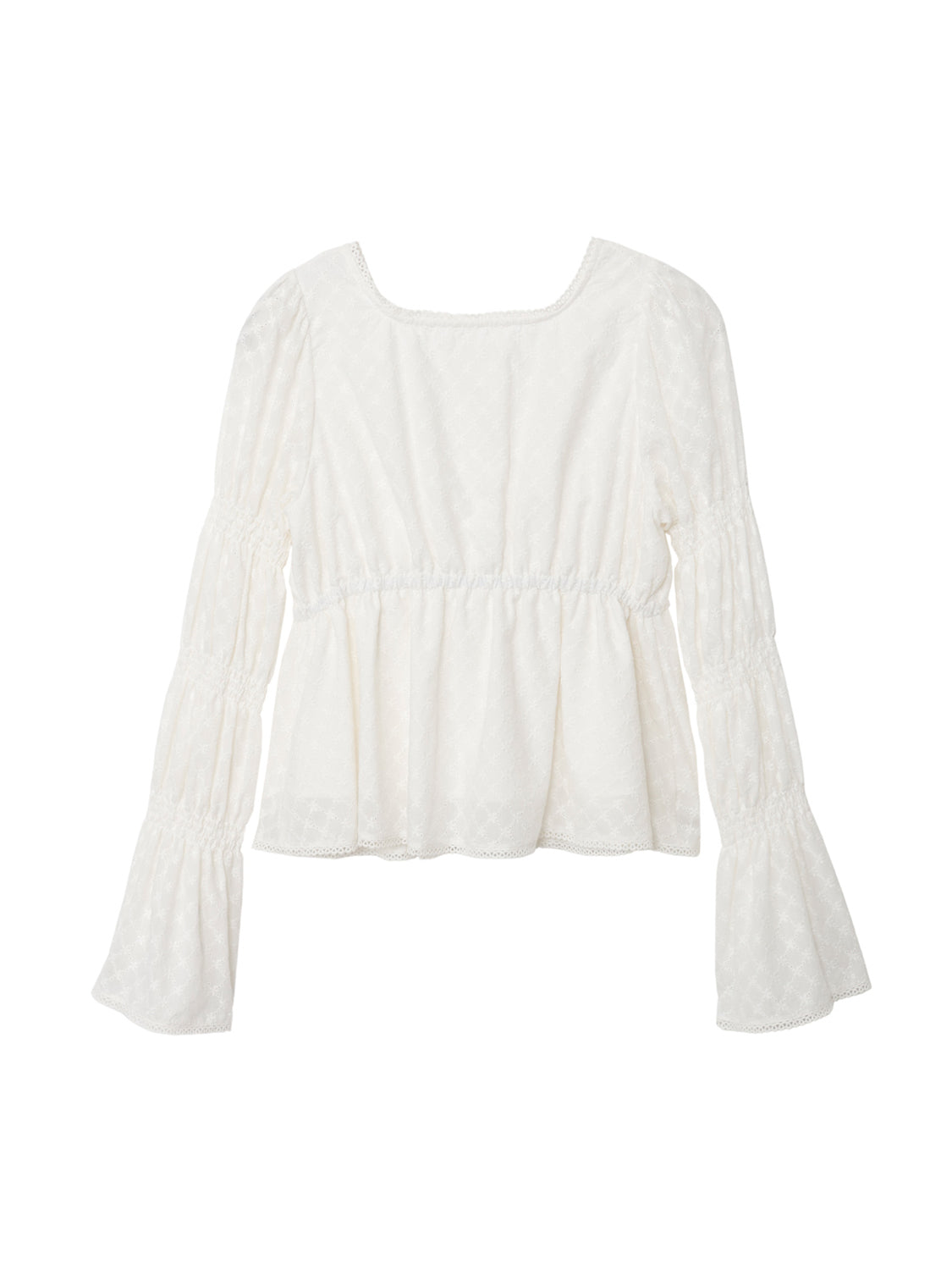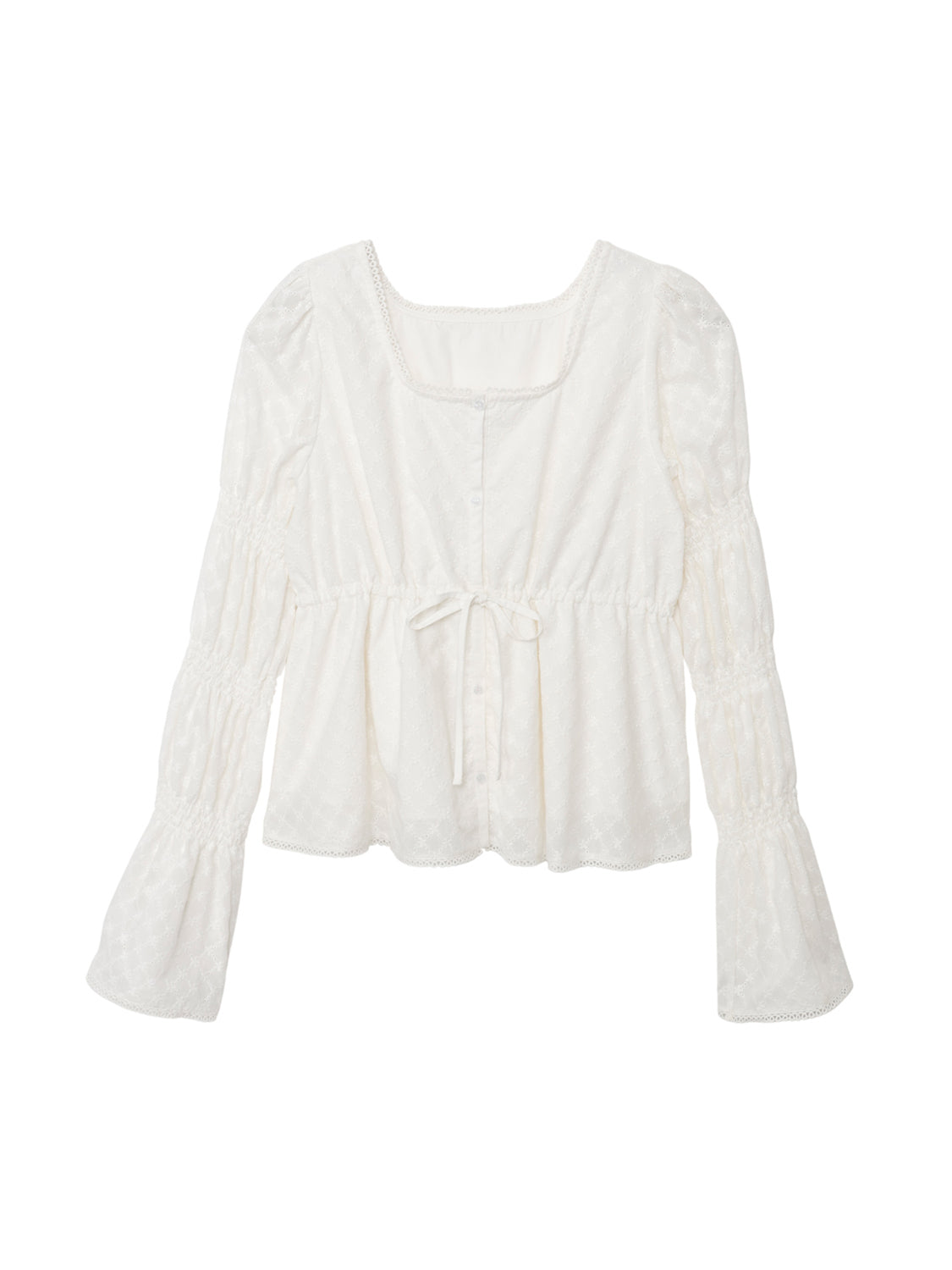 アイレット刺繍が施されたコットン100%のブラウス生地を使用。