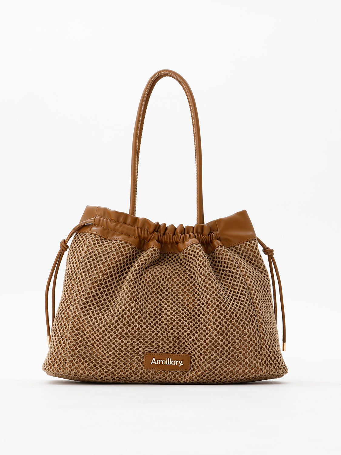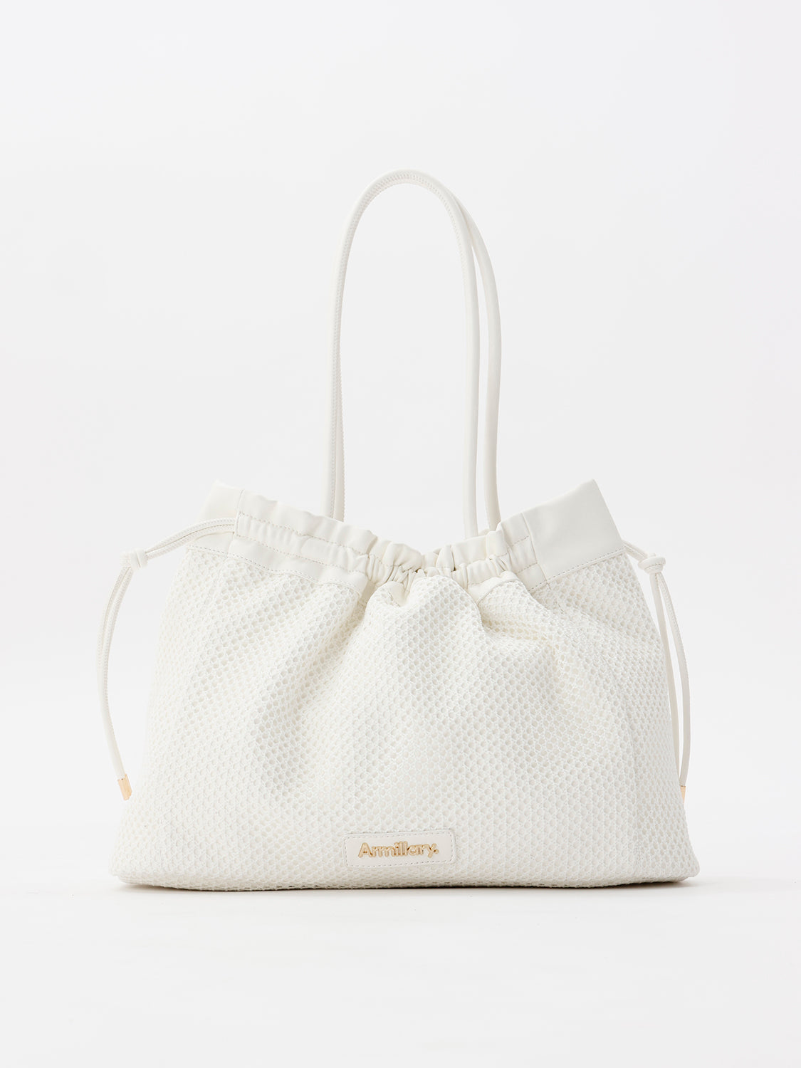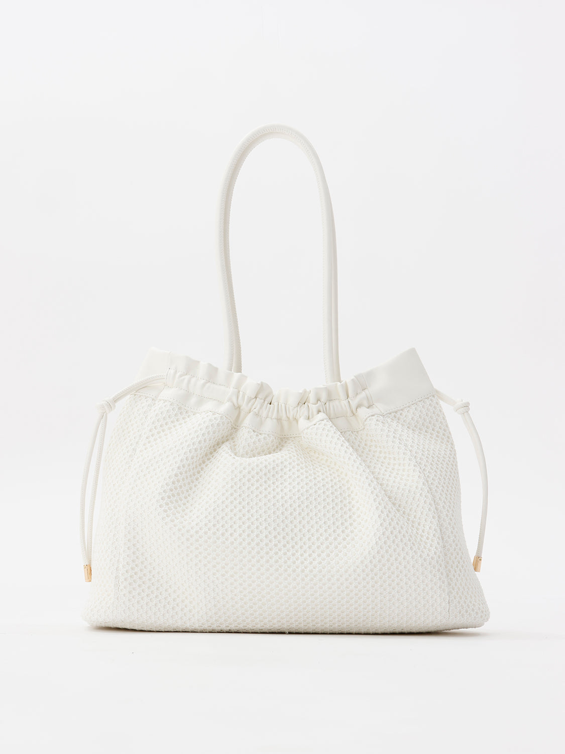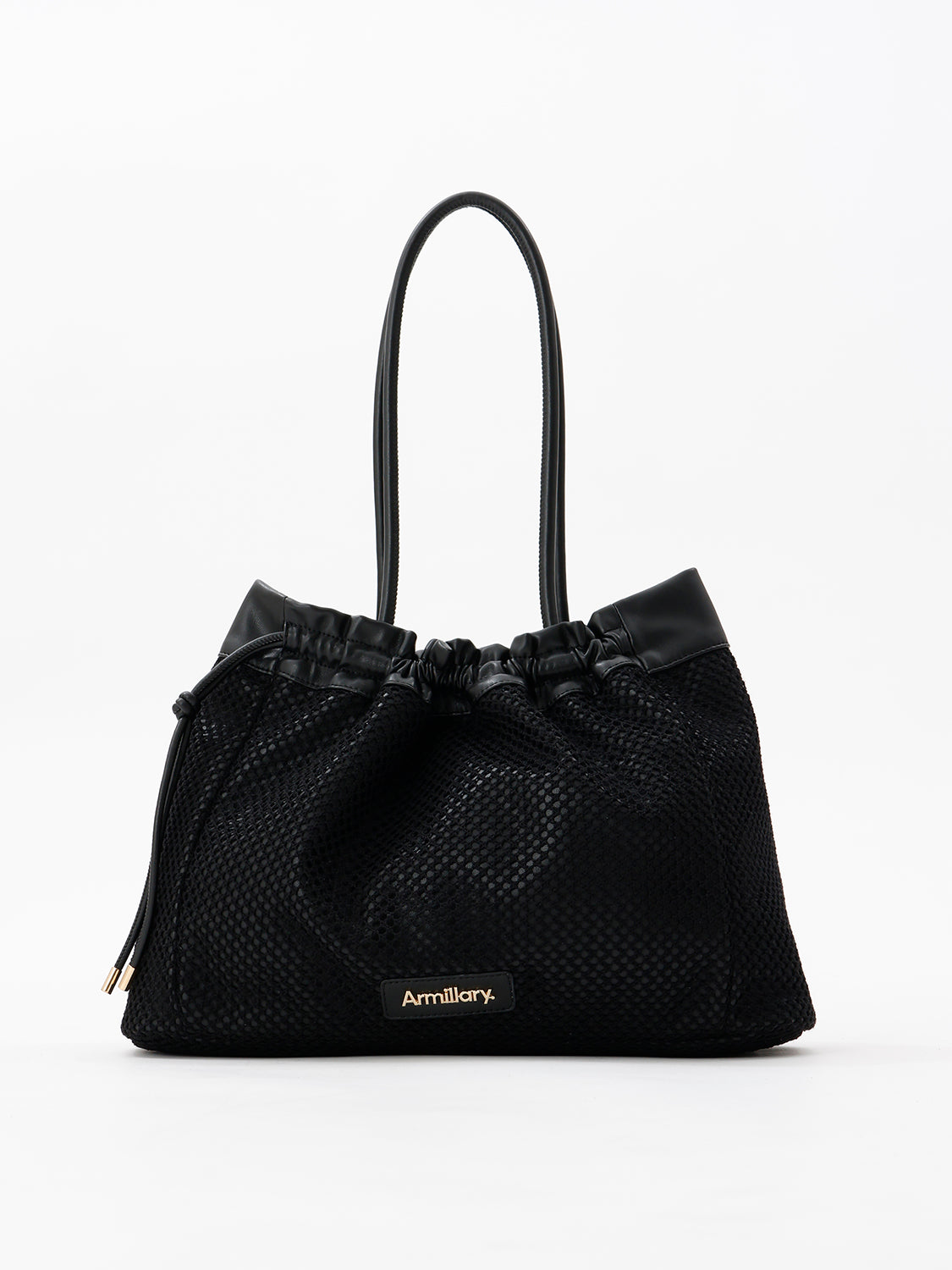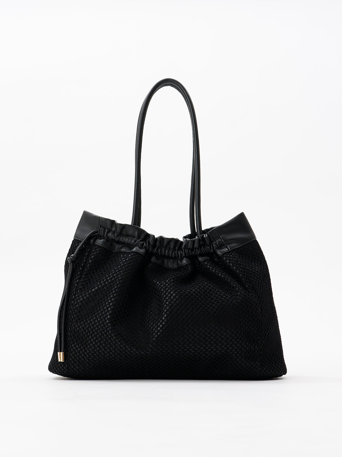 【デザイン】 合皮にメッシュを重ね、軽やかな表情に仕上げたトートバッグ。 開口部は絞り紐で口元のシルエットを調節できます。 ショルダーと口縁には合皮をあしらい、メッシュとの異素材コントラストがアクセントに。 フロントのゴールドロゴプレートが、カジュアルなメッシュの質感に程よい品を添えます。