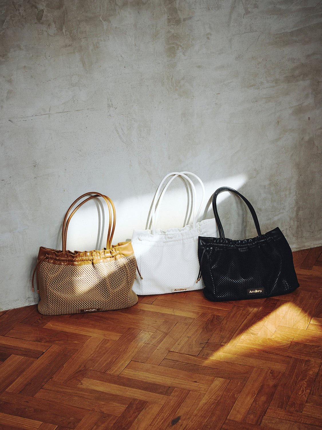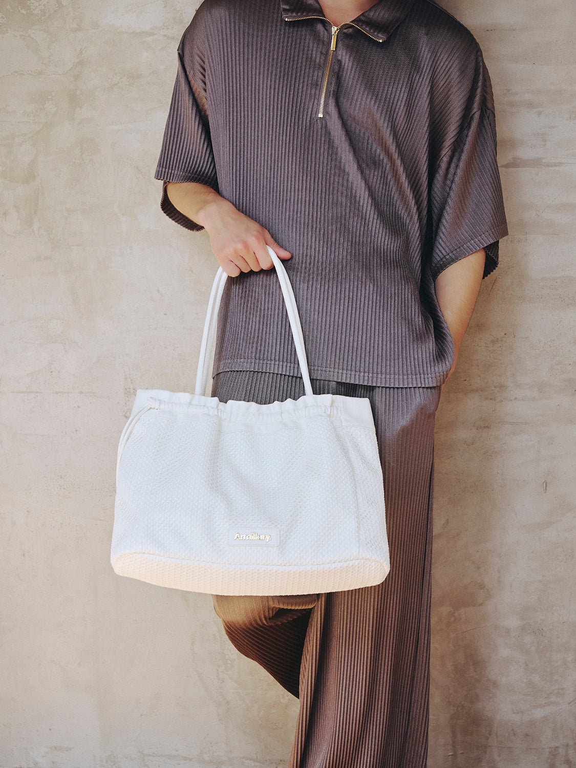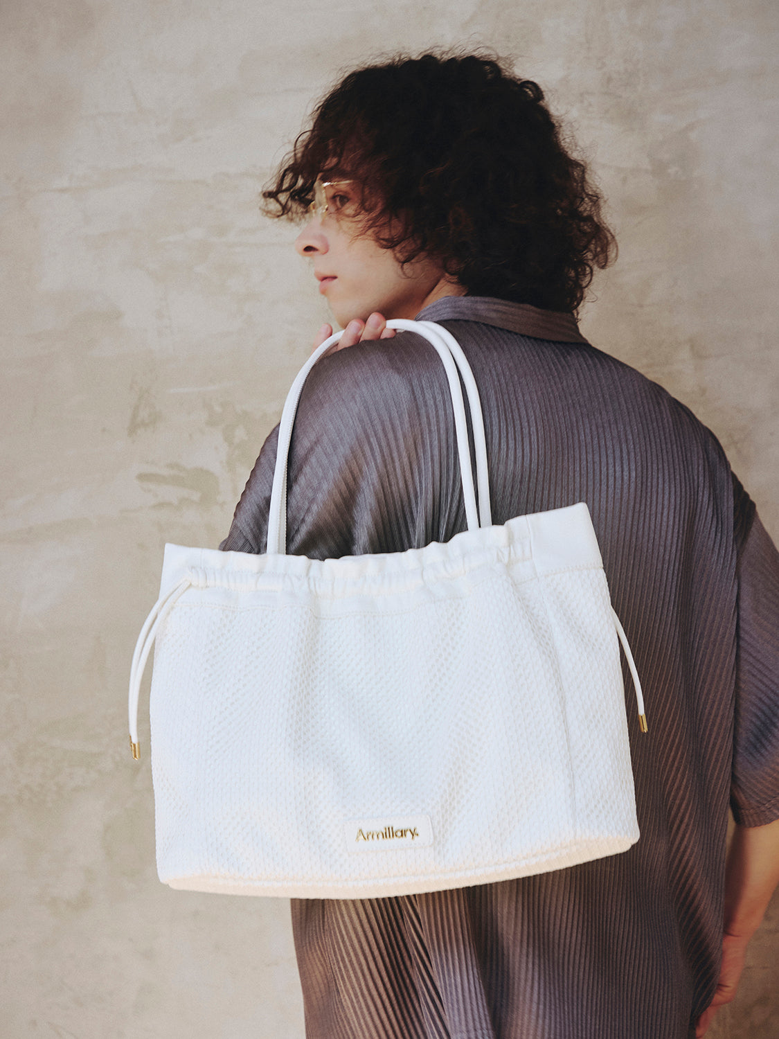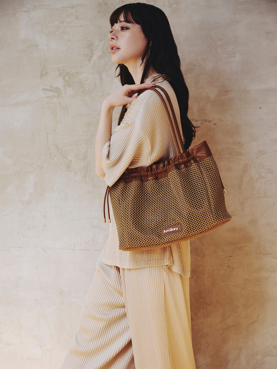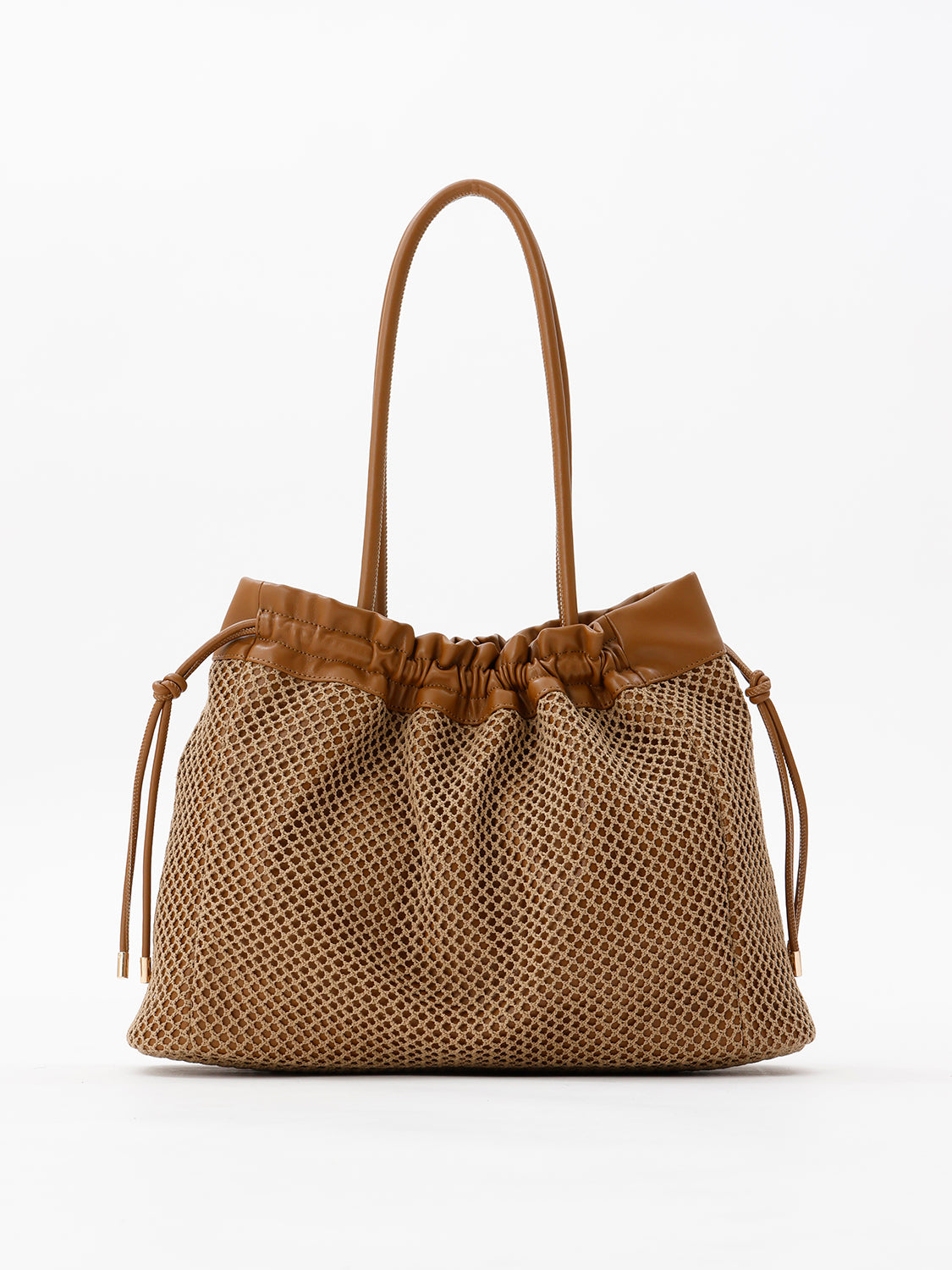 【デザイン】 合皮にメッシュを重ね、軽やかな表情に仕上げたトートバッグ。 開口部は絞り紐で口元のシルエットを調節できます。 ショルダーと口縁には合皮をあしらい、メッシュとの異素材コントラストがアクセントに。 フロントのゴールドロゴプレートが、カジュアルなメッシュの質感に程よい品を添えます。