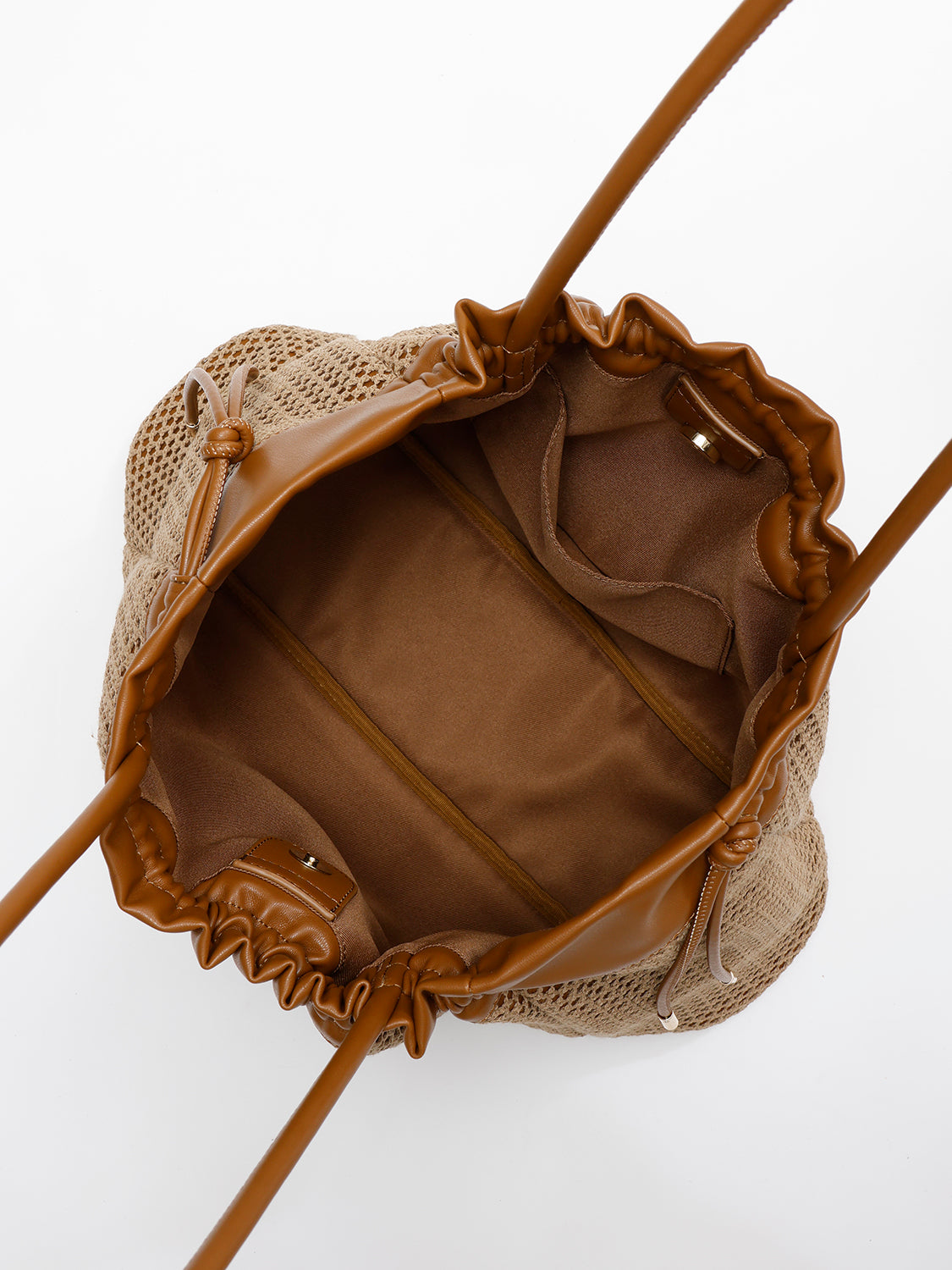 【生地感】 甘めに編まれたメッシュ素材。 口元とショルダーに使われた合皮は柔らかく手当たりがよく、肩や手に当たる部分もストレスのない質感です。